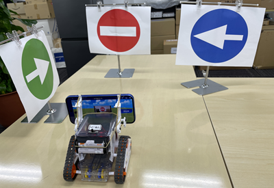 Teachable Machineで交通標識の画像を識別できるAIモデルを作成し、スマホのカメラで撮影した物理的な標識画像に従ってTAMIYAのクローラーが右折・左折・停止します。