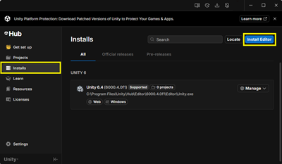 1. Unity Hubの左メニューから「Installs」を選択します。右上の「Install Editor」ボタンをクリックします。