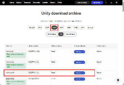 3. ブラウザで「Unity download archive」が開きます。年別に表示されるので、画面上部にある「2021」を選択し、「2021.3.45f2」の「INSTALL」ボタンをクリックします。