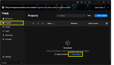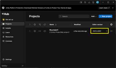 2. Unity Hubに戻り、左メニューから「Projects」を選択します。上記4で作成したプロジェクトが表示されます。