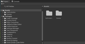 1. 「Project」画面で、Assets>CarEvolution>Scenes を選択します。右側に表示される「Scene1」をダブルクリックします。