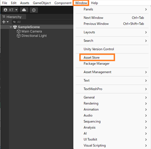 上部の「Window」メニューを選択し、続いて「Asset Store」を選択します。