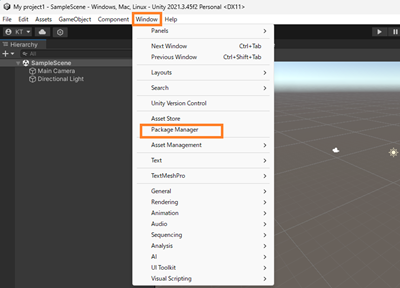 4. 上部の「Window」メニューを選択し、続いて「Package Manager」を選択します。