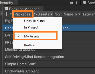 5. 「Package Manager」画面の左上部の「▼ Packages」を選択し、続いて「My Assets」を選択します。