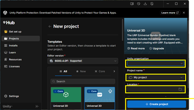 2. 画面の入力項目に従い、新規プロジェクトを作成します。「Unity organization」は自分のユーザー名、「Project name」は任意のプロジェクト名、「Location」はプロジェクトを保存する場所*を指定します。