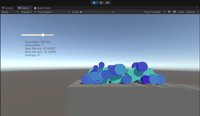 3. 多角形と4つのタイヤから成る車体が生成され、コースを走り出します。遺伝的アルゴリズムにより、適応度の高い個体を次世代に残していきます。詳しくは、「Project」画面から Assets>Docs>CarEvolution _ja.pdf を選択し、解説をご参照ください。