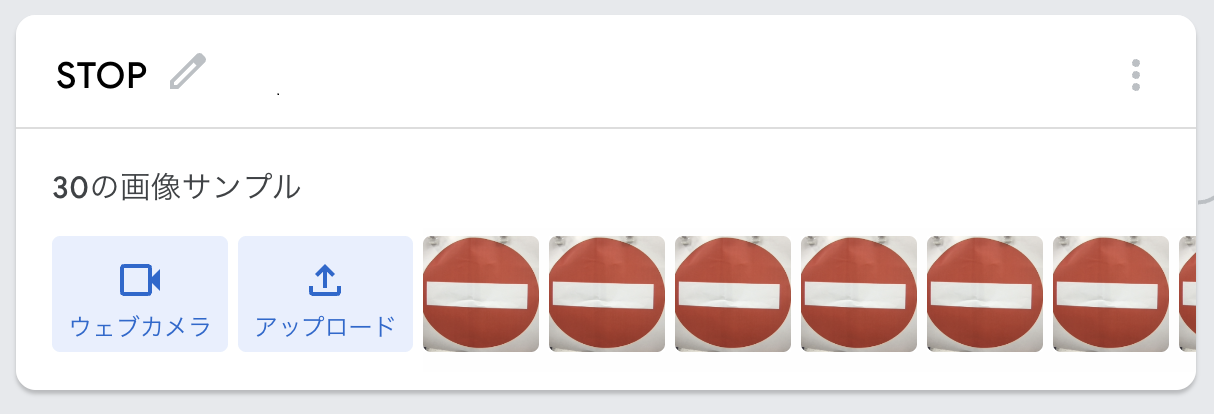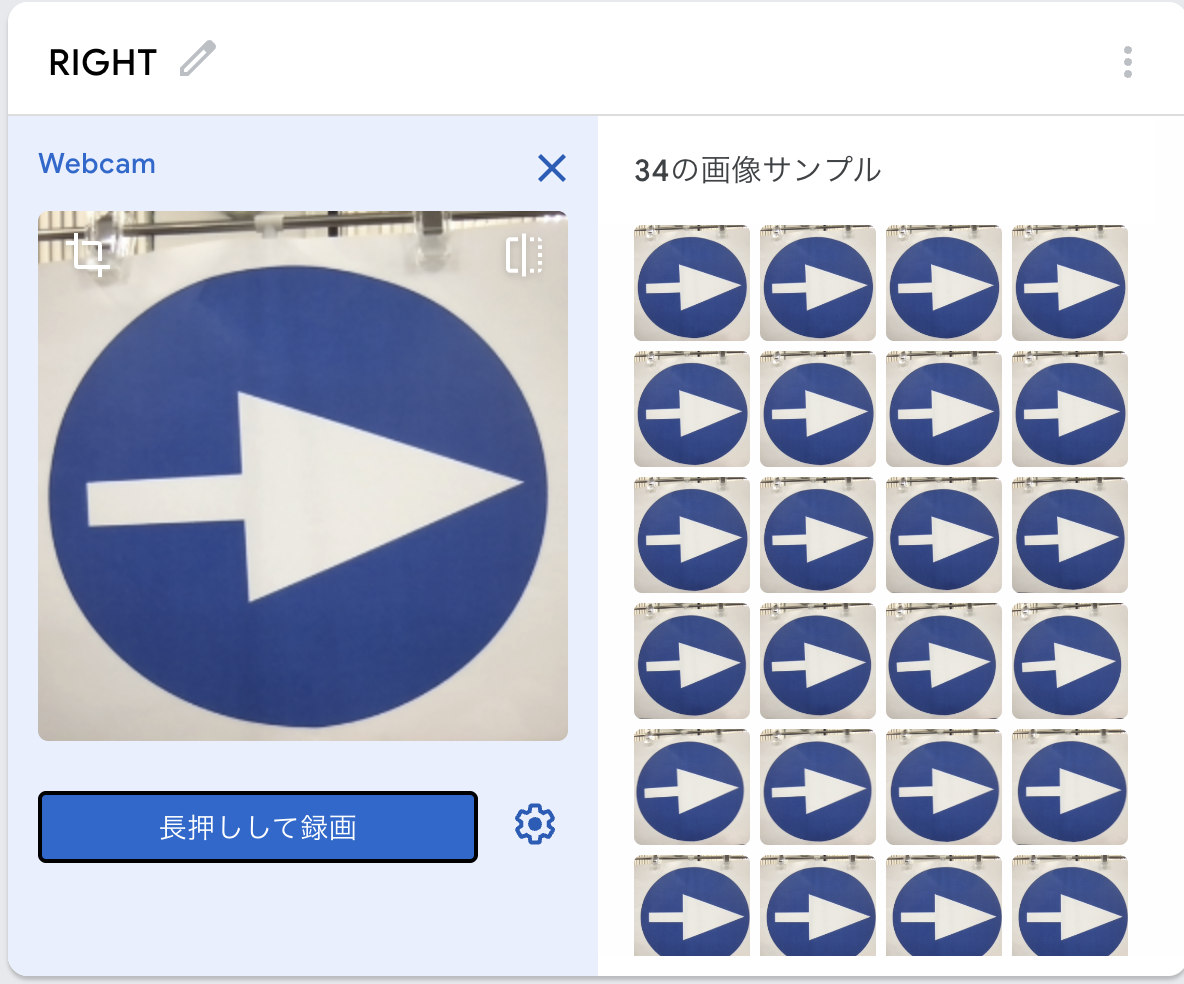Teachable Machine の「画像サンプルを追加する」で「ウェブカメラ」を選択し、「長押しして録画」します。多数の画像が一度に撮影されます。