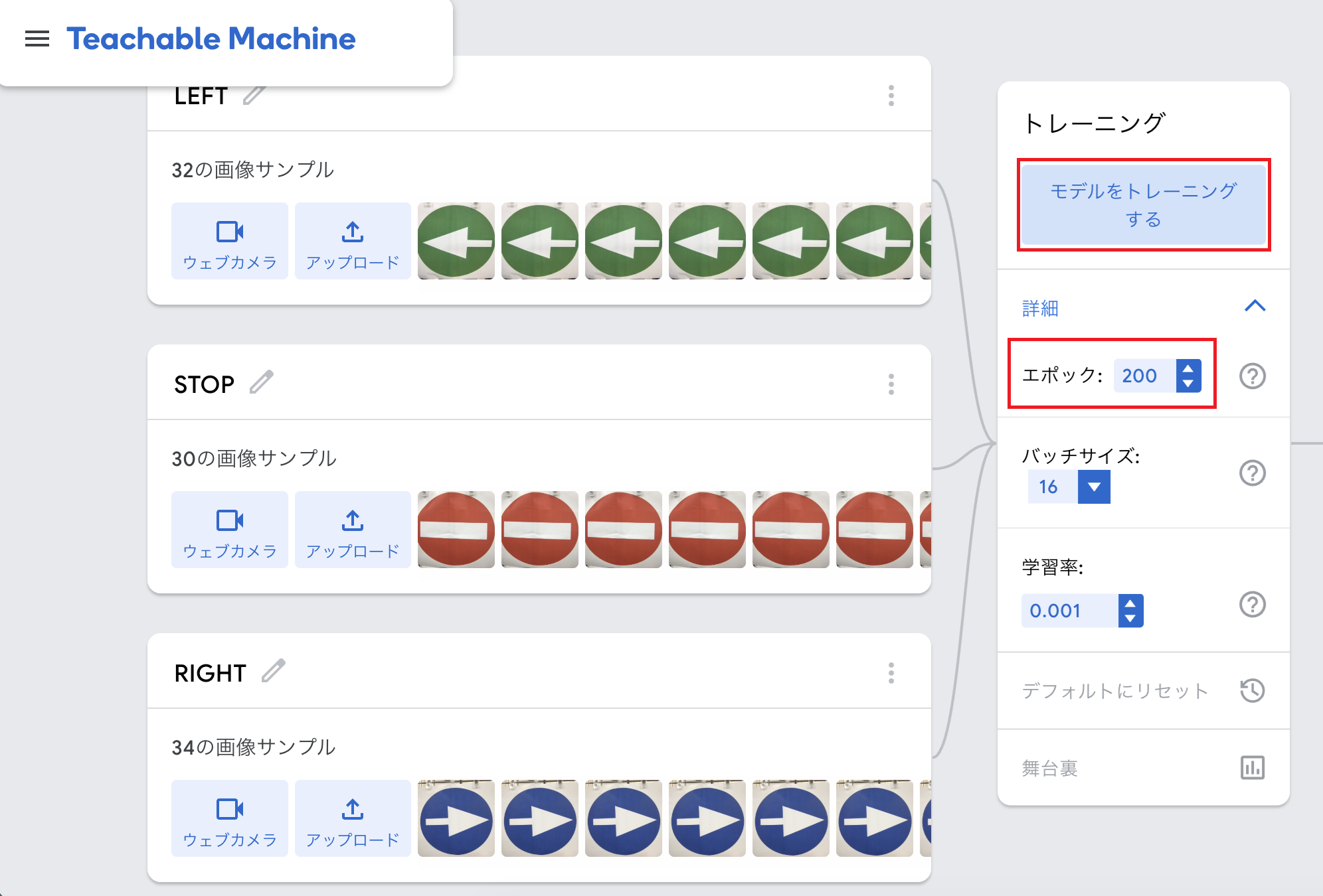 この例題では、STOP(停止)、RIGHT(右折)、LEFT(左折)という3つの標識を認識させます。それぞれのアクション(クラス)を設定します。
