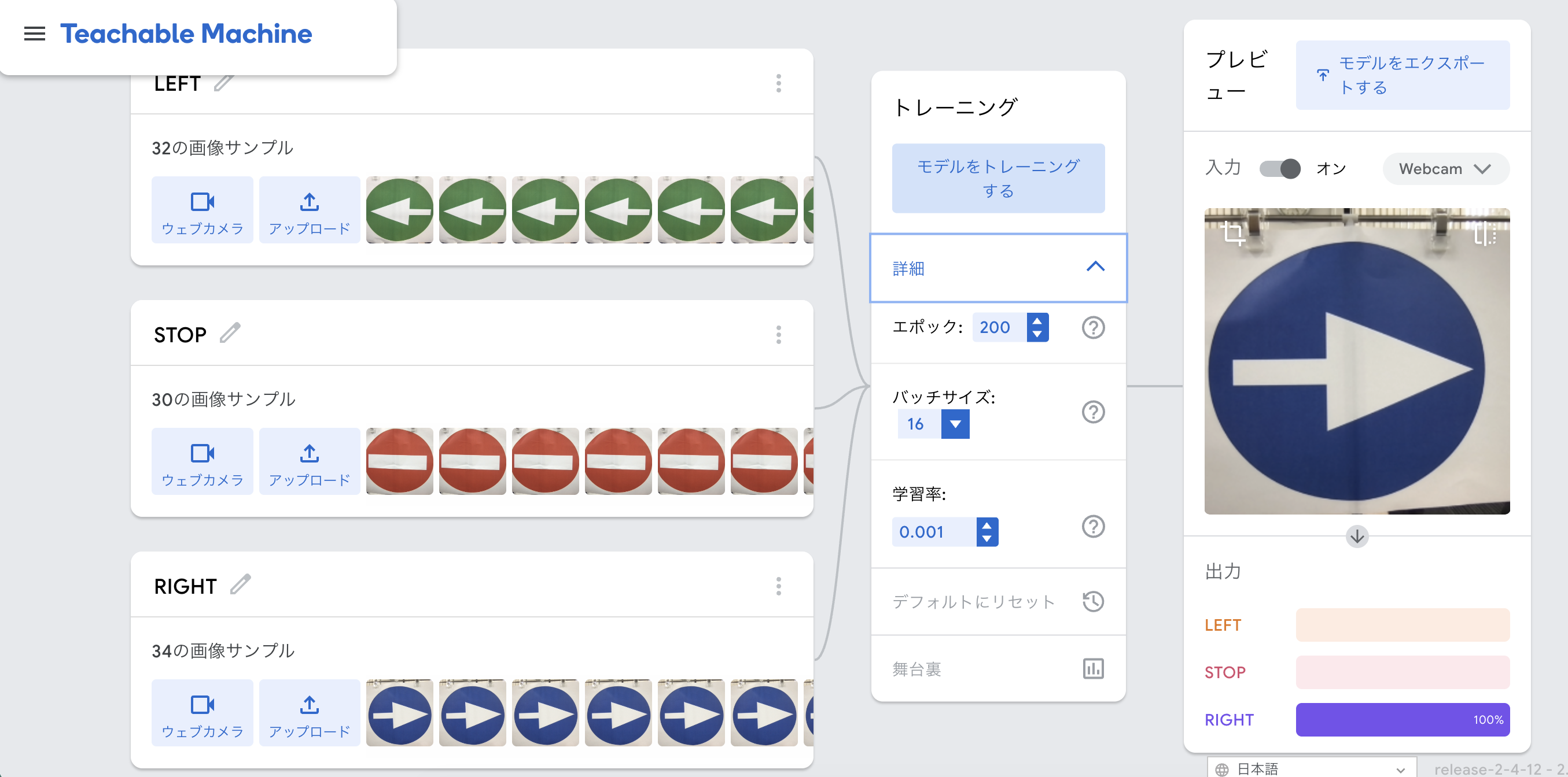 トレーニングが完了したら、精度を確認することができます。カメラで標識を撮影して認識率を確認します。