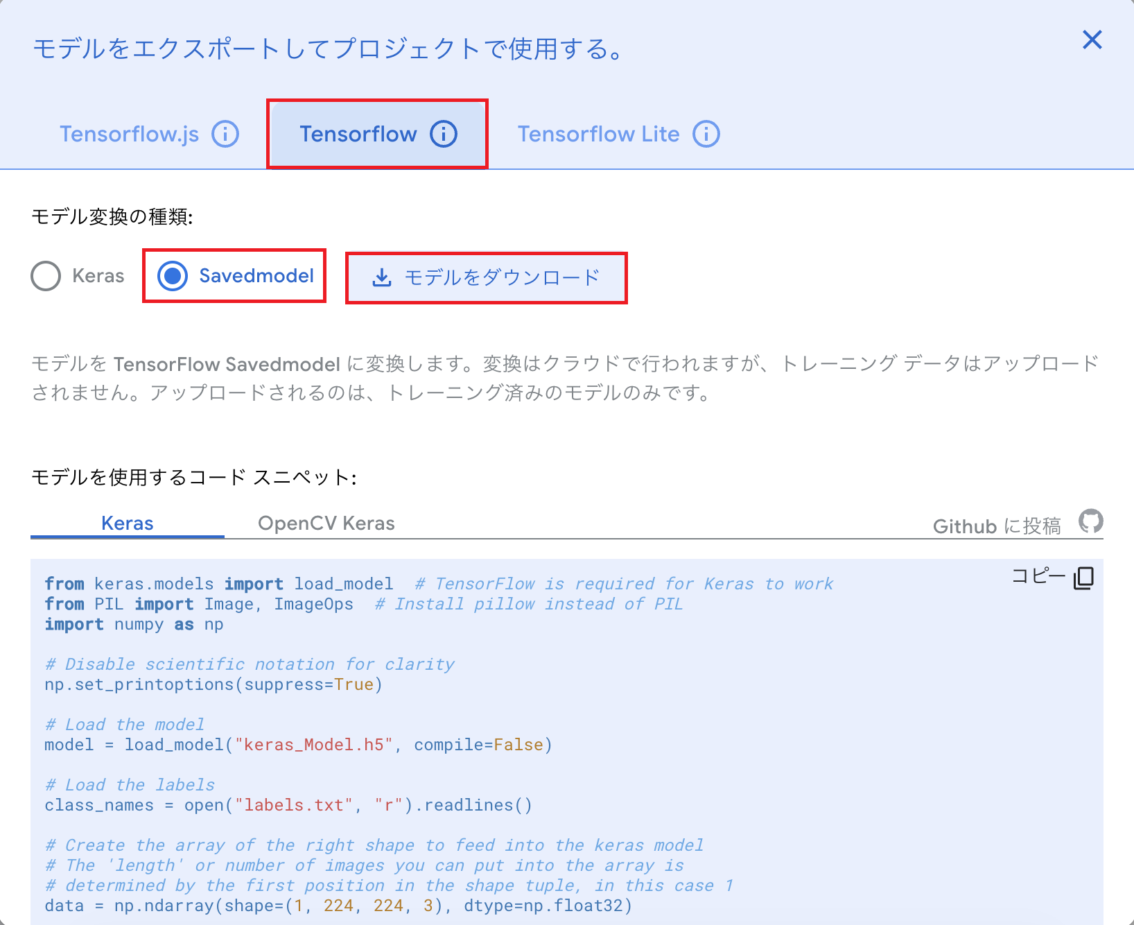 1. Tesorflow、Savedmodelを選択し、「モデルをダウンロード」します。