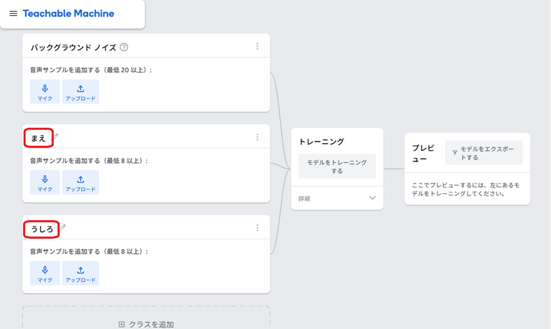 この例題では、「まえ」、「うしろ」、「みぎ」、「ひだり」、「ストップ」とい5つの音声を認識させます。それぞれのタイトルを入力します。「バックグラウンドノイズ」には周囲の音(雑音)を録音します。