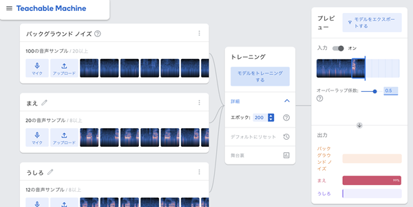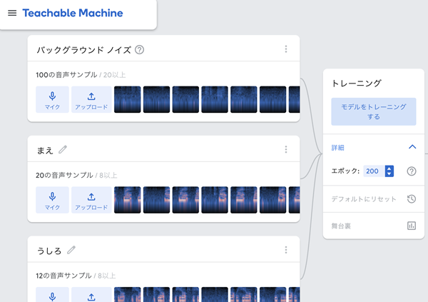 *エポック:この値を調整することでモデルの学習精度を調整することができます。値が大きいほどよく学習します。デフォルトは50ですが、サンプルでは200に設定しました。