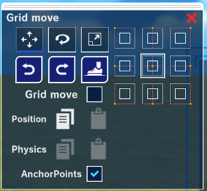 In the Scene Editing screen, select the object (such as a button) for which you want to set an anchor point. Next, in the displayed dialog, check the “Anchor Points” option. Select the anchor point (where on the screen you want the object positioned relative to – e.g., top-left corner, right edge center, etc.). Finally, specify coordinates in the area at the top-right of the screen where you set the coordinates, angles, and sizes. (These are the distance from the anchor point to the object’s origin. The origin is typically the object’s center.)