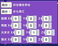 新しい分身ブロックを追加しました。1つのブロックで、作成された分身の座標、角度、大きさ、作成後に加える力の強さを設定できます。(「テクニック」カテゴリー)
