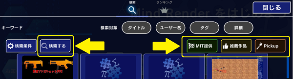 「MIT提供」、「推薦作品」、「Pickup」ボタンからそれぞれの作品を簡単に検索できます。
