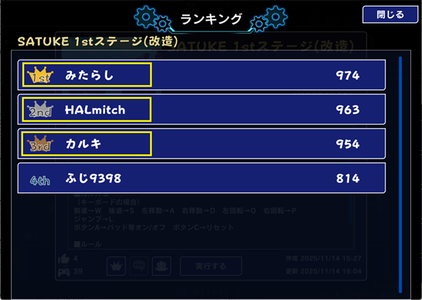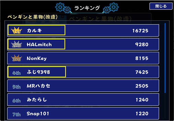今回のコンテストは「SATUKE 1stステージ(改造)」(原作者:たけをさん)、「ペンギンと果物(改造)」(原作者:HiZAPULTさん)で行いました。楽しんでいただけましたでしょうか?